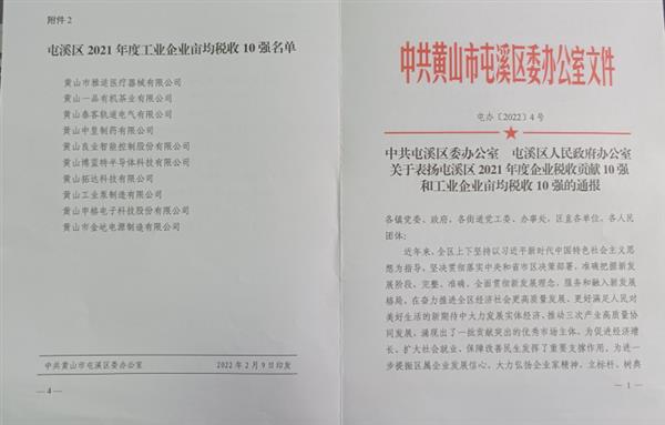 會上區(qū)委、區(qū)政府對屯溪區(qū)2021年度企業(yè)稅收貢獻10強和屯溪區(qū)2021年度工業(yè)企業(yè)畝均稅收10強企業(yè)予以通報表揚。我公司2021年畝均稅收15.56萬元,榮獲屯溪區(qū)2021年度工業(yè)企業(yè)畝均稅收10強企業(yè)(排名第五)。