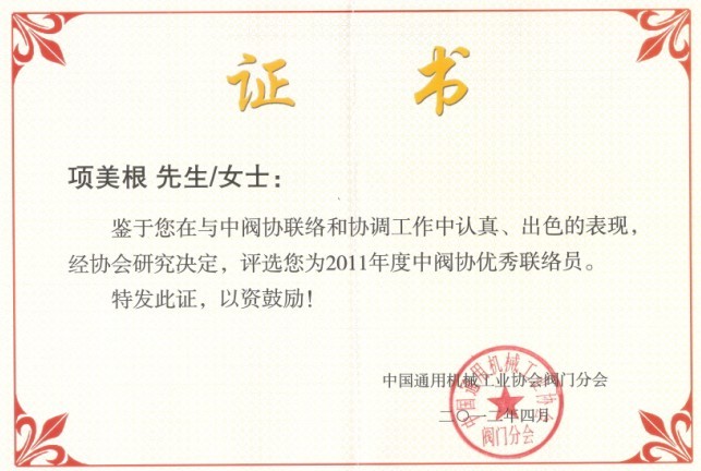 黃山良業(yè)閥門有限公司董事長是一位年長的全國閥門行業(yè)工作者,具有豐富的行業(yè)工作經(jīng)驗(yàn),鑒于他在與中國通用機(jī)械工業(yè)協(xié)會閥門分會聯(lián)絡(luò)和協(xié)調(diào)工作中認(rèn)真、出色的表現(xiàn),被該協(xié)會評選為“2011年度中閥協(xié)優(yōu)秀聯(lián)絡(luò)員”。