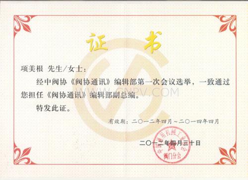 泵閥交易網(wǎng)訊  經(jīng)中國閥門行業(yè)權威刊物:《閥協(xié)通訊》編輯部第一次會議選舉,一致通過,項美根董事長擔任《閥協(xié)通訊》編輯部副總編。